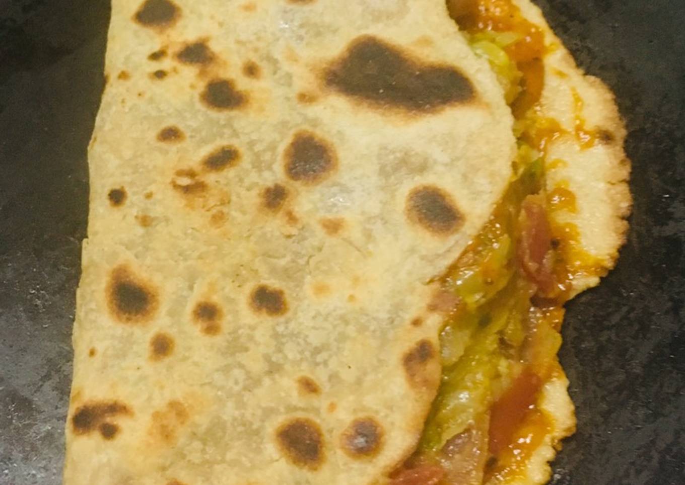 - Take a pan and prepare a roti and roast it with butter. Then apply the prepared sauce evenly and place potato stuffing on one side of Roti.