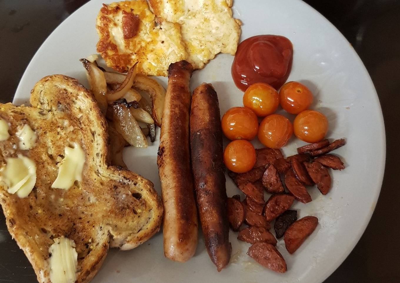 - Add the Chorizo and cook for about 3 minutes. Then all cooked serve hot with toast and a blob of your favourite Sauce.