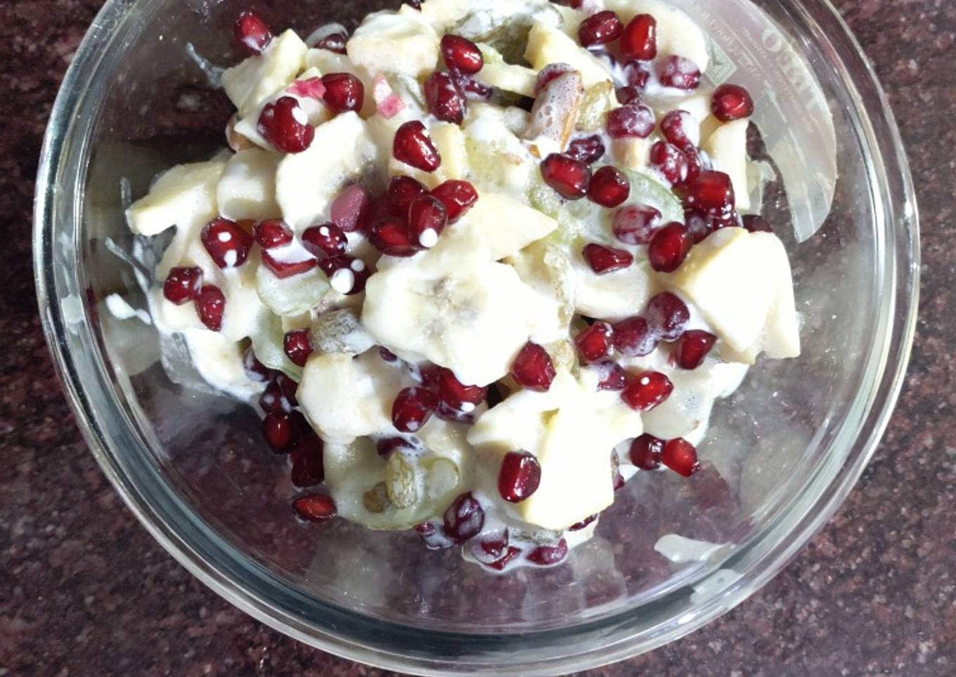 - In a big bowl add apple, pomegranate and grapes.Now add fresh cream and sugar mix well.Also add vanilla essence into it.