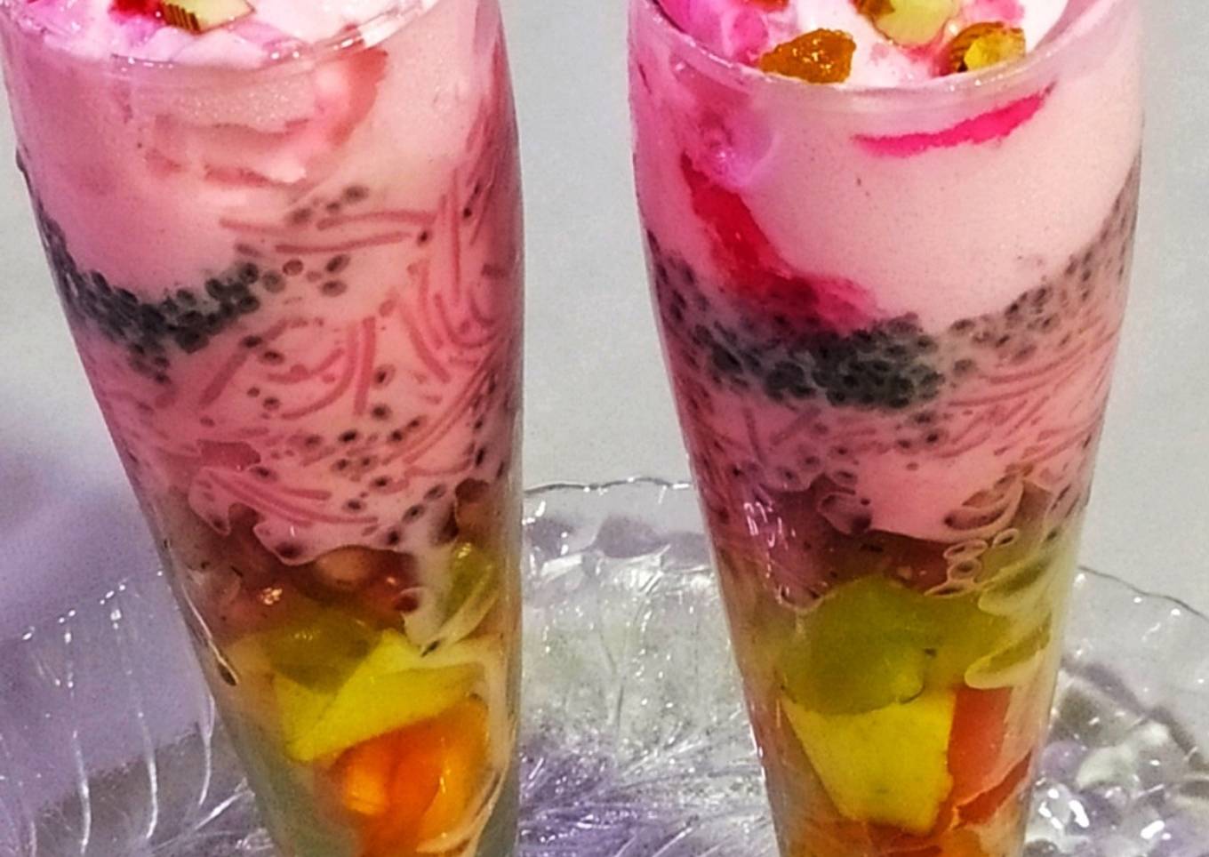 - Cut all fruits and dry fruit ready in a bowl. Take serving glass. Add chopped fruits one by one with the help of spoon. Papaya then apple set it. Add grapes then add pomegranate seeds then Add sabja seeds 1 spoon and spread it Add Falooda mix vermicelli. Add one scoop strawberry icecream. garnish with dry fruits and topping with rose rooh afza.. so here strawberry Falooda is ready to serve...